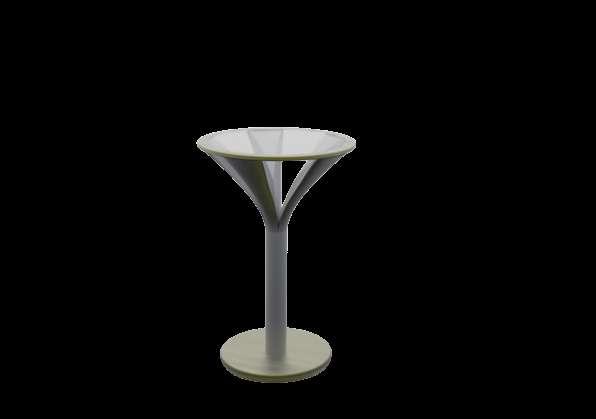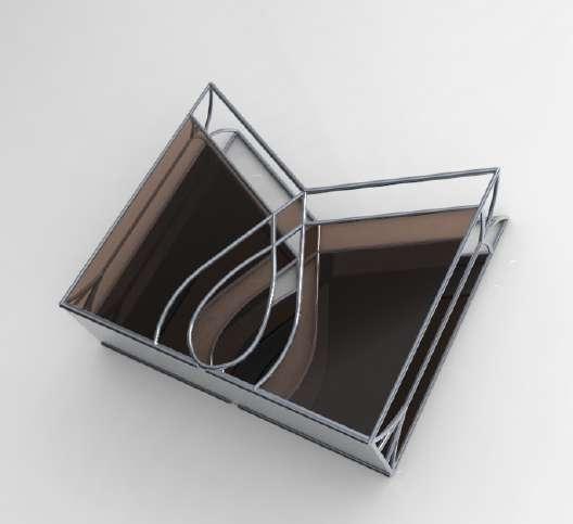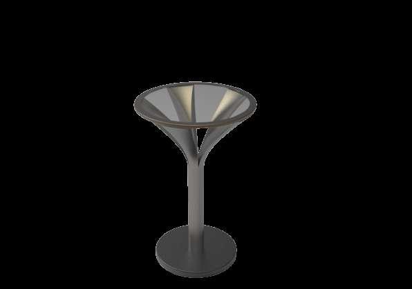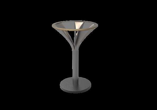 透過玻璃桌面,可看出支架和桌面的關聯性,由下往上、由內而 外自然向上延伸而形成車輪的樣貌,同時,運用輪框的概念,在 支架上切割出一些角度,是我採用工業風原件的想法。