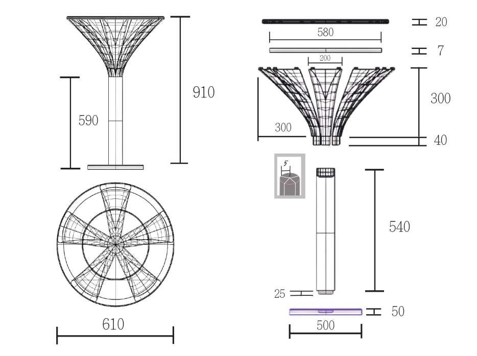 中間結構為五根支架合為一體的型態,以披薩方式拼合。