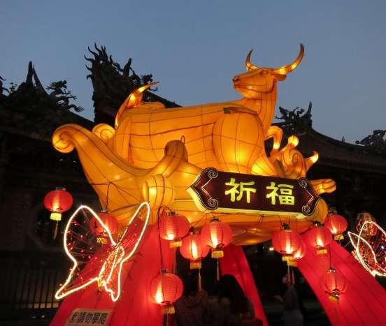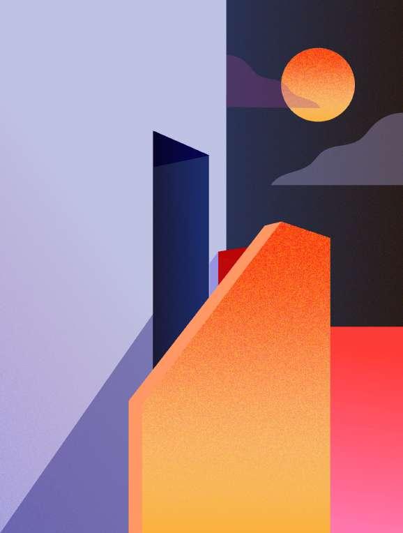 在夜晚中,一輪明月映照在牆面上,並以主 要色塊形成強烈對比,使整體畫面提亮。