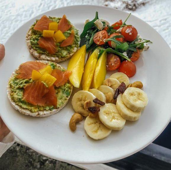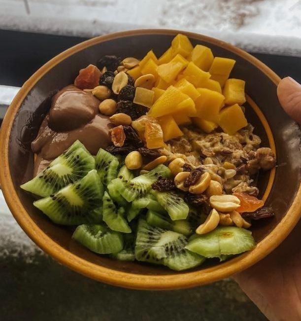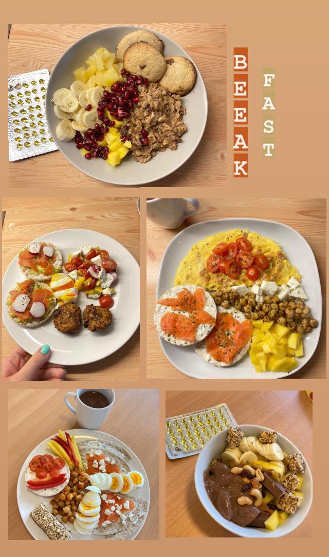 Breakfast is the most important meal of the day- it gives energy, good vibes and it’s also too healthy to not skip it. I usually have 2 types of breakfast that I like to redesign differently, depending also on what I have in the fridge. The first type of breakfast is: oatmeal + fruits (I usually put mango, banana, kiwi or pineapple), protein pudding, cereal bar, mix of hazelnuts, cashews, nuts. Most of the time I put exactly what I find in the fridge, that’s why most of the time it looks different. Mainly I make sure that it is a protein breakfast, which will give me energy and fill me up until the next meal. Oat porridge is very healthy because it helps digestion throughout the day.