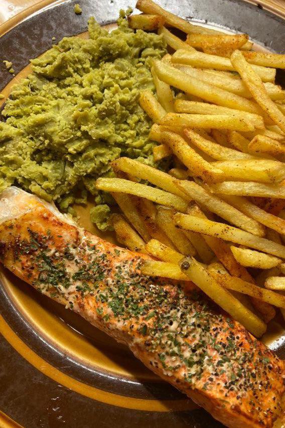I end the day with dinner, which is the most substantial meal. Most of the time I prefer to eat fish. One of my favorite recipes is: baked salmon with spices (with two slices of lemon and cheese on top), pea puree (pre-boiled canned peas are fried in a little oil and then mashed with a fork) and fried potatoes. Another recipe is pasta with pesto and tuna, which is very easy and quick to make: fry the onion, then add the tuna and the green pesto sauce. When I cook pasta, I like to combine all kinds of tastes and textures. For example, in another pasta recipe I used onions, sliced cherry tomatoes, spinach, mango pieces and Parmesan cheese.