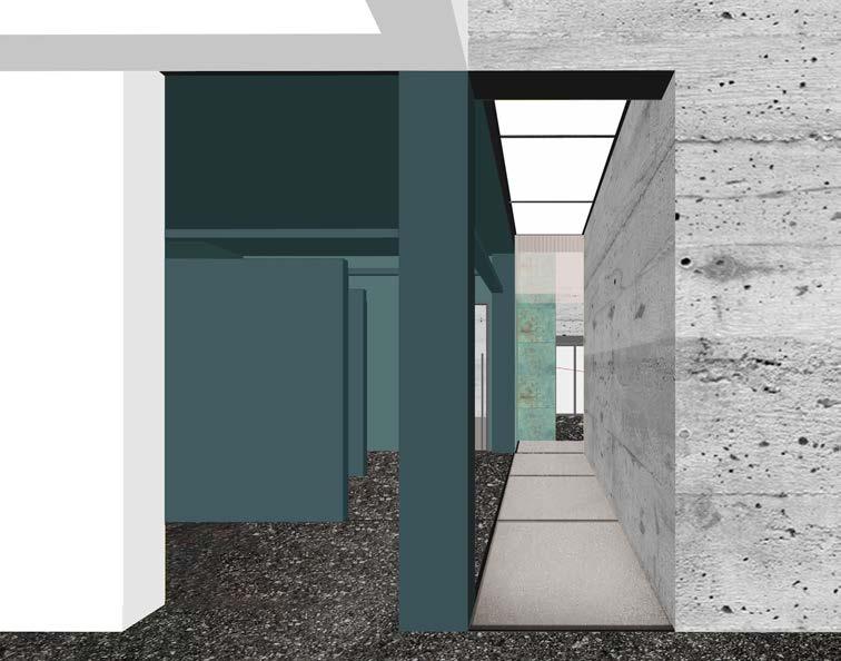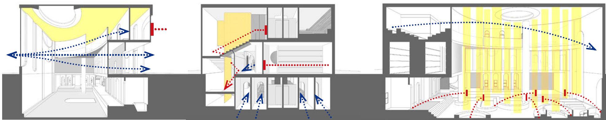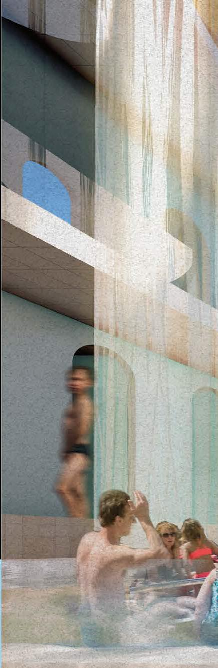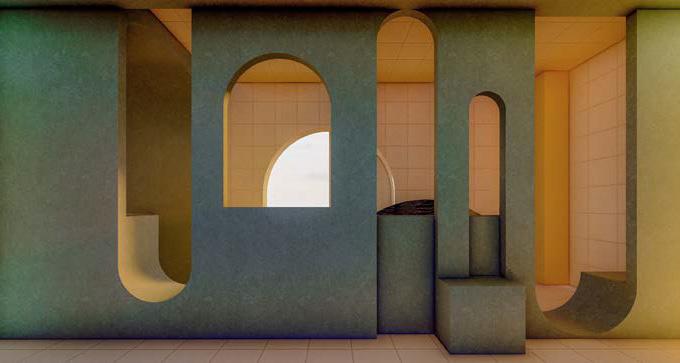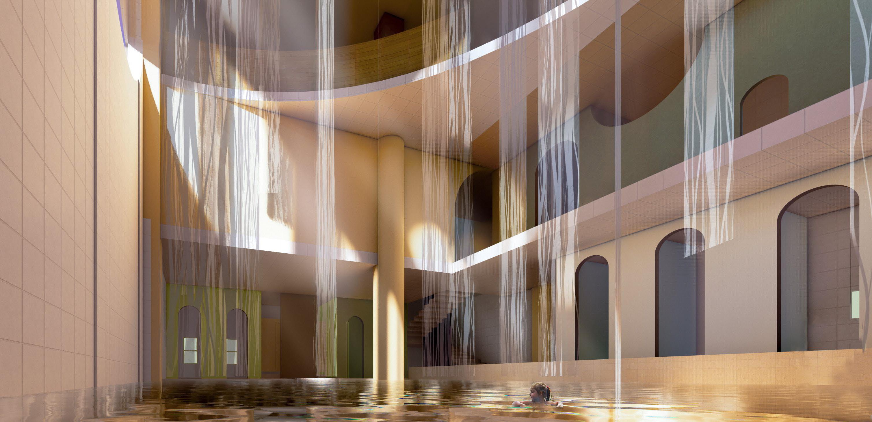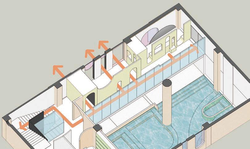 At the beginning, the guests will be confined to a small space. Once they enter any doorway, they will see the misty bathing atmosphere behind them through several arches.