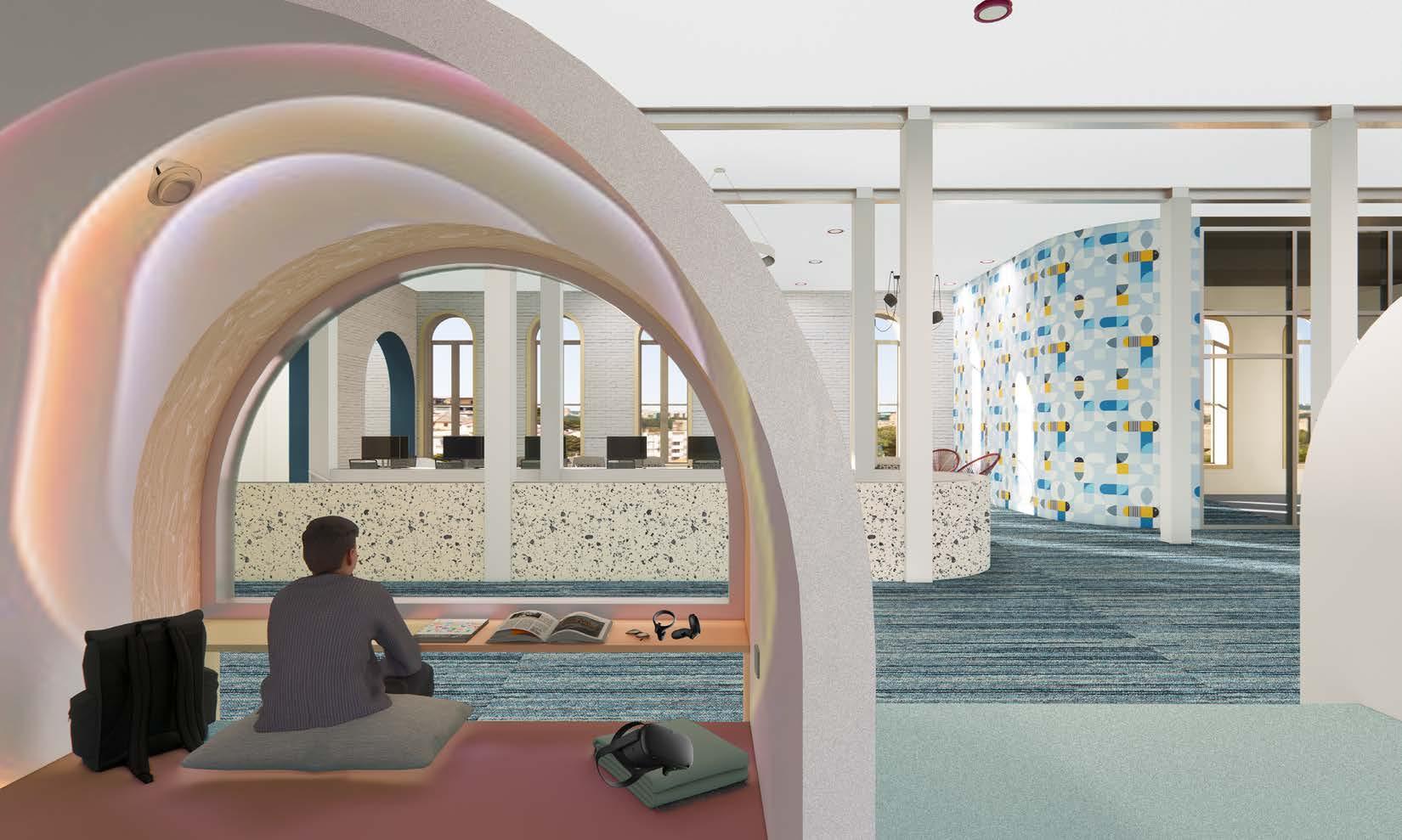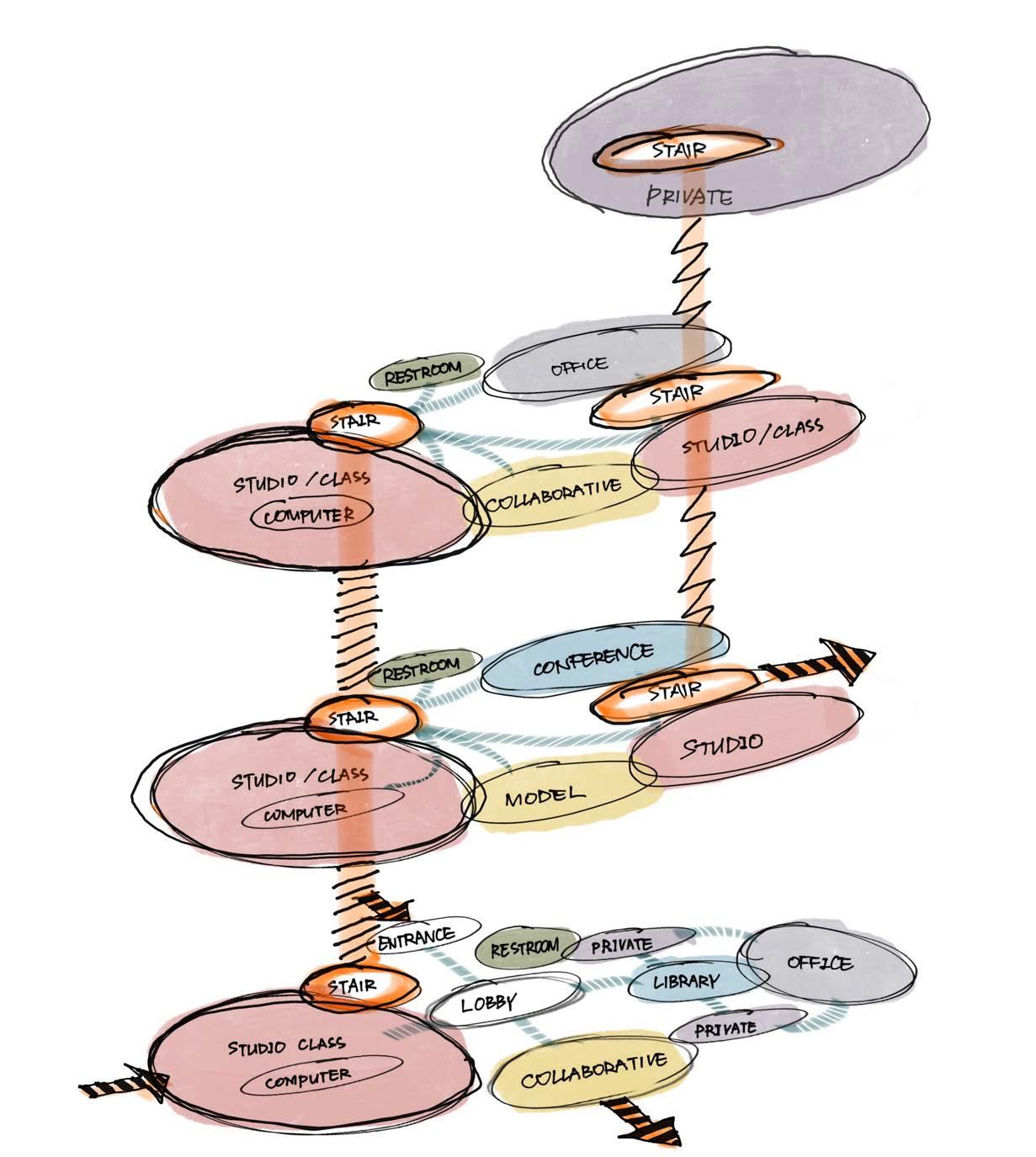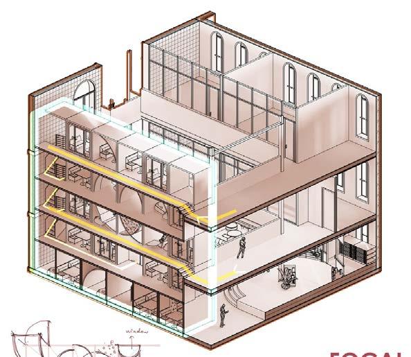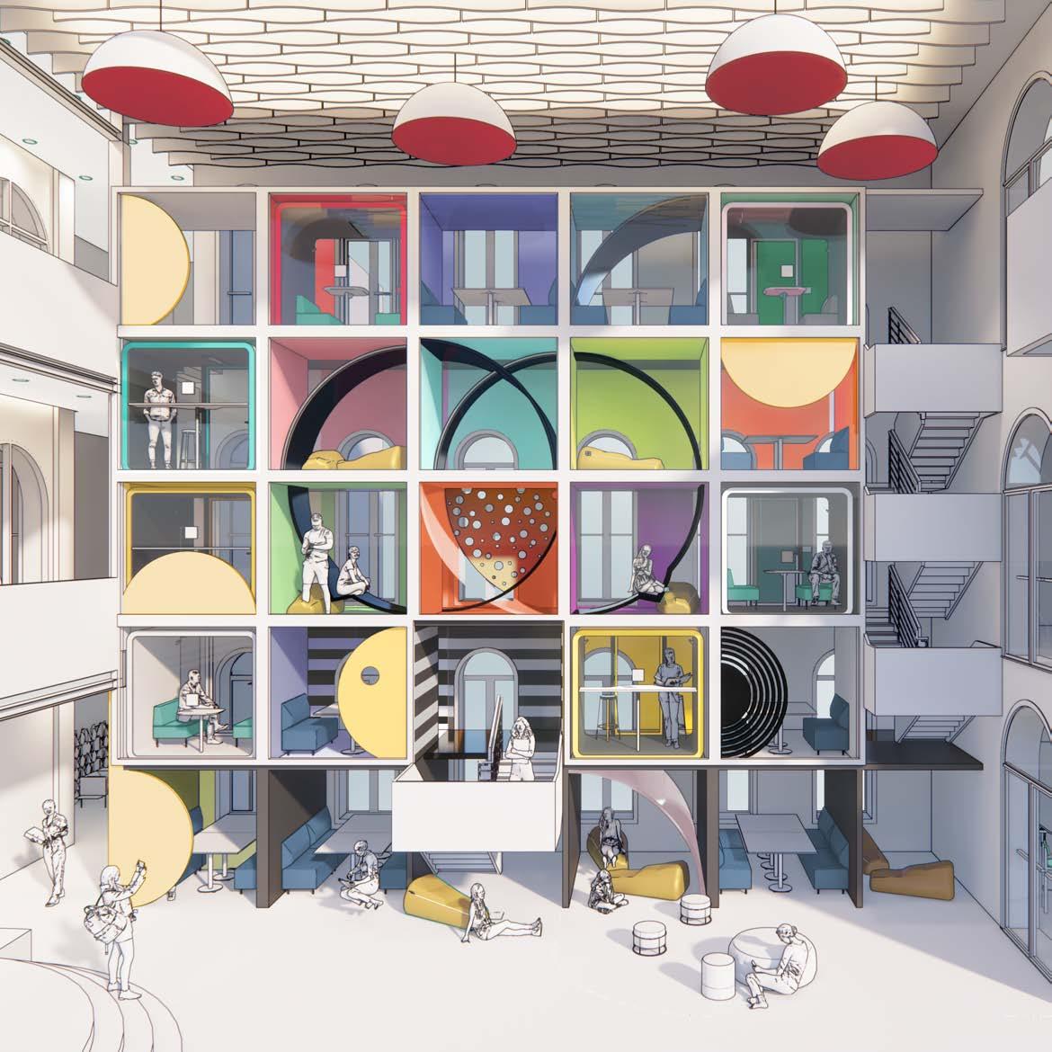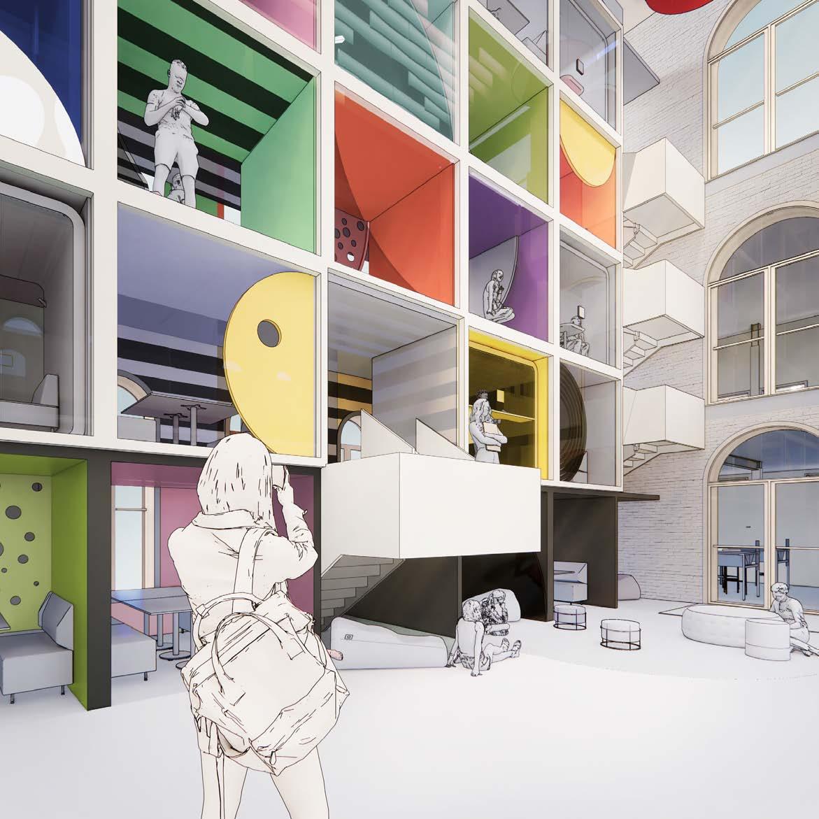 This will be an inspiring home for SCAD members. The vibrant space encourages mutual engagement and collaboration, which will inspire them with each other. At the same time, the nest-like space will provide them with a sense of home.