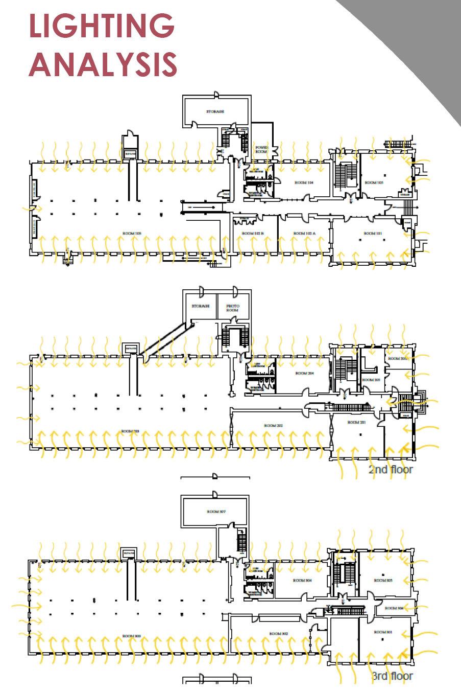 1. The building receive most of its natural light from the south-east corner. Because the sun is always to the south and the east window is larger.