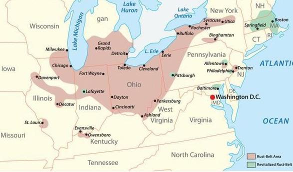 The Rust Belt refers to the geographic region from New York through the Midwest that was once dominated by manufacturing.