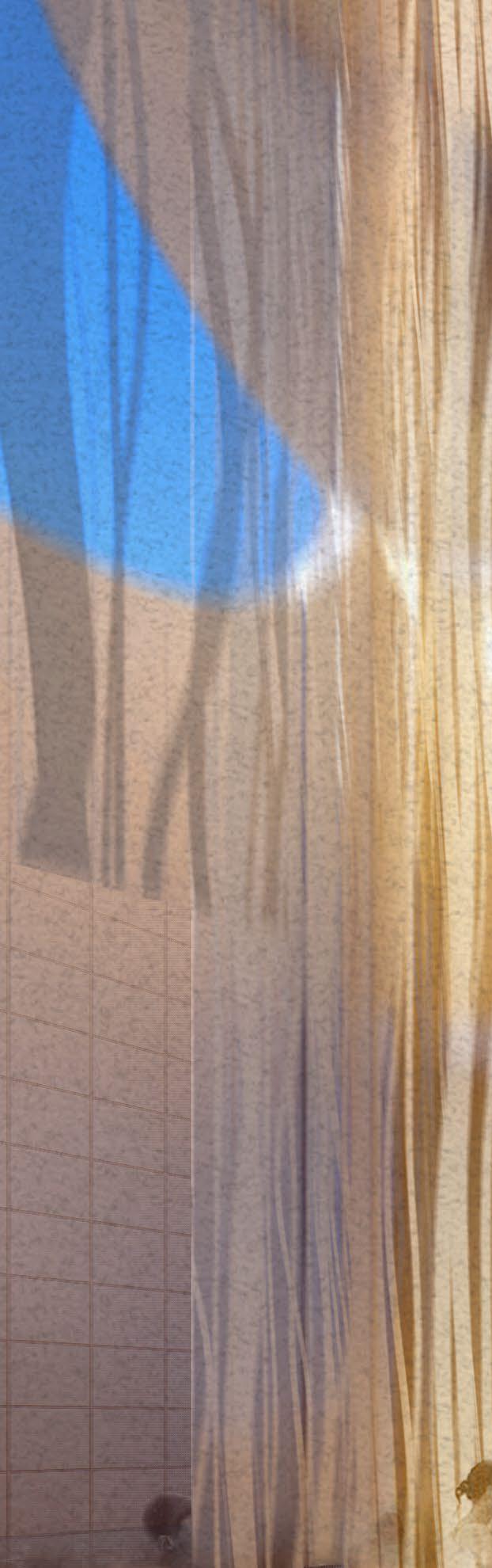 People in the pool can't easily see each other because they are blocked by the hanging curtains , with the Tyndall effect caused by water mist and light.