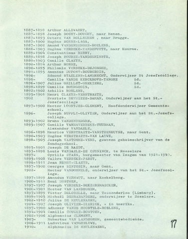 Arthur ALLElvAERT, Joseph DOCHY-DOUCHY, naar Menen. Octave VAN HOLLEGHEM , naar Brugge. Eugène RONSE-LAGA, Amand VANDENBEHGHE-ROELENS, Eugène V1<::RBEKE- VANDEPUTTE, naar Kuurne. Constantinus REBRY, Joseph BOUREZ-VANDEGHINSTE, Camil.1e CLA):!:YS, Arthur RONSE, Philomin VERBEKE-DEJONGHE, Amantus DUPONT-BOURGEOIS , Edrn ond STAELENS-LAMDRECHT, Onderwijzer St Jozefscollege. ' Camille VANDE KERCKHOVE-TANGHE id. id. Julius GRILLET-GHEKIERE, Camil1e BOURGEOIS, id. Ach111e ROELENS, Henri CLAEYS-VERSTRAETE, Evariste DEVHIEZE-DAHAN, Onderwijzer aan het St._ Jozefscollege Hector LOONTJES-CLEMENT. Hoofdonder\vi jzer Gemeenteschool. Joseph SUPPLY-OLIVIER, Onderwi jzer aan het St.-Jozefscollege. Bruno VANDEITDEHGHE, Carnille VANHAVERBEKE-THUHMAN, Alexander VANDAELE, Maurice VERSTRAETE-VANSTEENHUYSE, naar Gent. Eugène VERSTRAETE-VAN LAm·IE, Joseph VANTOMME-VENS, gewezen geheimschrij ver van de Zondagschool Joseph DE RAED1'p Louis VANDAELE-DE CEUNINCK, te Roeselare Cyril1e STAES, burgemeester van Izegem van 1921- 19 4 n . Valère VERBEKE-PARET, J"ean REBHY - CLAI!;YS, Ge orges SINTOBIN p naar Gent. Hector V I\.N DOMi'I ELE , onderwijzer van het St.- Jozefscollege . Amandus VI<jRî-1AUT~ naar Koekelberg. Remi lJOSTOEN, Joseph VERBEKE-DBKE mSNAECI\J'~R, H . ct or VAN LANDEGHEÎ"I p Victor DELOBELLE, naar Tessenderloo (Limburg ). Hichaë1 DEDRABANDERE, onderwijzer te Beselare. Julius DE MEULENAERE, Joseph OLIVIER-DIBRICK, + in Amerika. Adhemar VANDE MOORTELE-ROELENS , Camille COUCKE-BOSTOEN , Alphonsius CLEMI~NT, Hubertus VAN LANDEGHEM, gemeent e bediende . Ludovicus VANGHELUWE, Alphons:Lu:::> DI~ HEULENAERE, Q