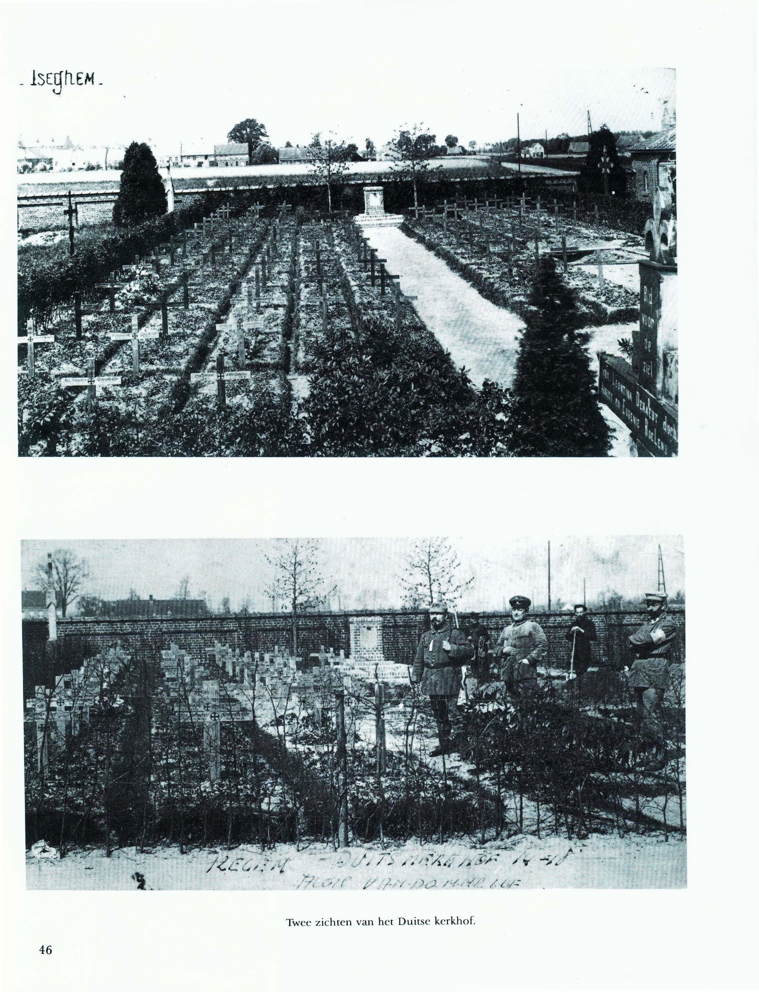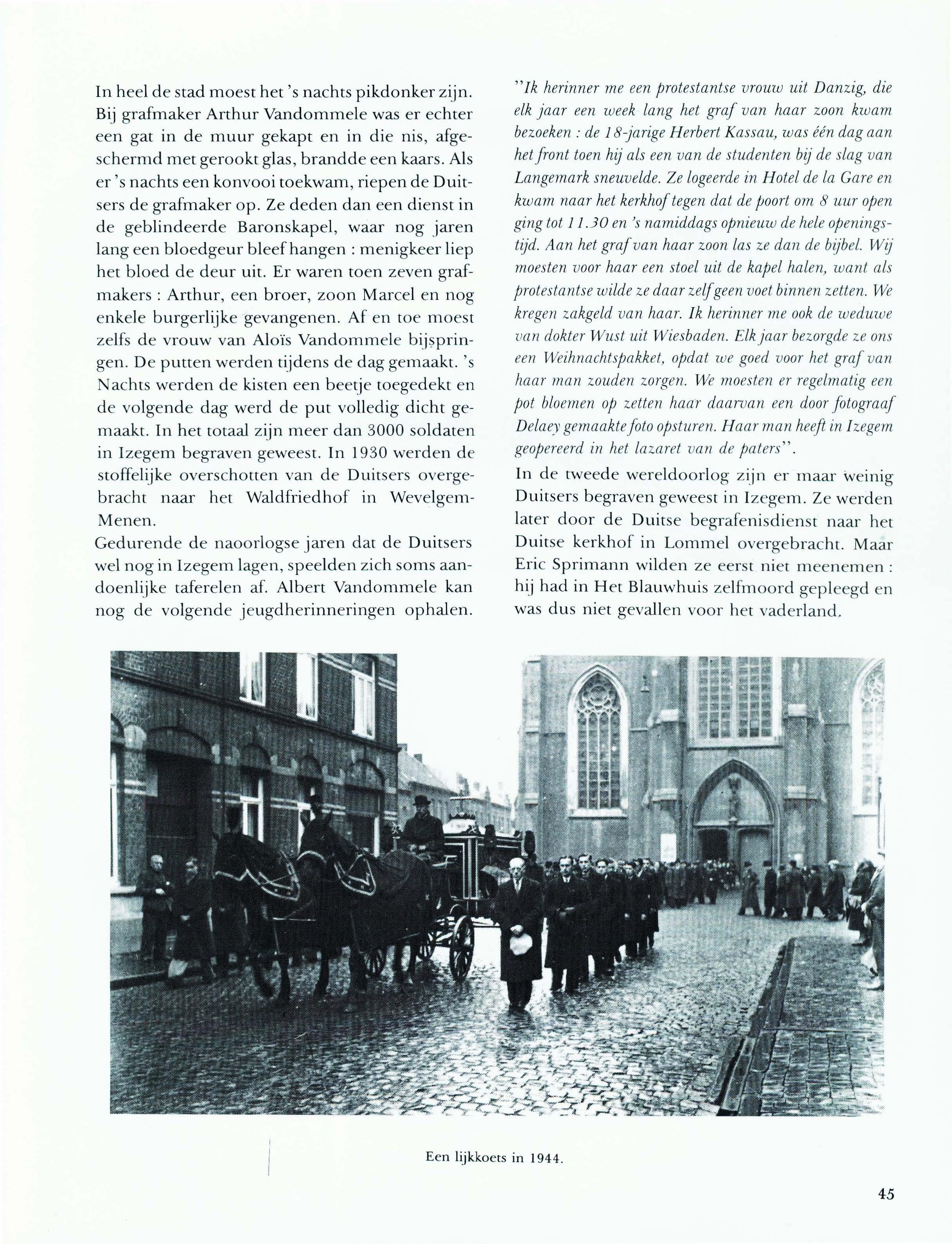 "Ik herinner me een protestantse vrouw uit Dan z ig, die elk jaar een week lang het graf van haar zoon kwam bezo ek en : de 18-jarige Herbert Kassau, was één dag aan het front to en hij als een van de studen ten bij de slag van Langema rk sneuveld e. Ze logeerd e in Hot el de la Gare en kwam naar het kerkhof tegen dat de poort om 8 uur open ging tot 11 .30 en 's na middags opnieuw de hele openingstijd Aan het graf van haar zoon las ze dan de bij'bel, Wij' moesten voor haar een stoel uit de kap el halen, want als protestantse wilde ze daar zelfgeen voet binnen zetten. We kregen zakgeld van haar. Ik herinn er me ook de weduwe van dokte r Wust uil Wiesbaden. Elk jaar bezorgde ze ons een Weihnachtspakkel, opdat we goed voor het graf van haar man zouden zorgen. We moesten er regelmatig een pot bloemen op zetten haar daarvan een door fotograaf Delaey gemaakte foto opsturen , H aar man heeft in Izegem geopereerd i n het lazaret van de palers " .