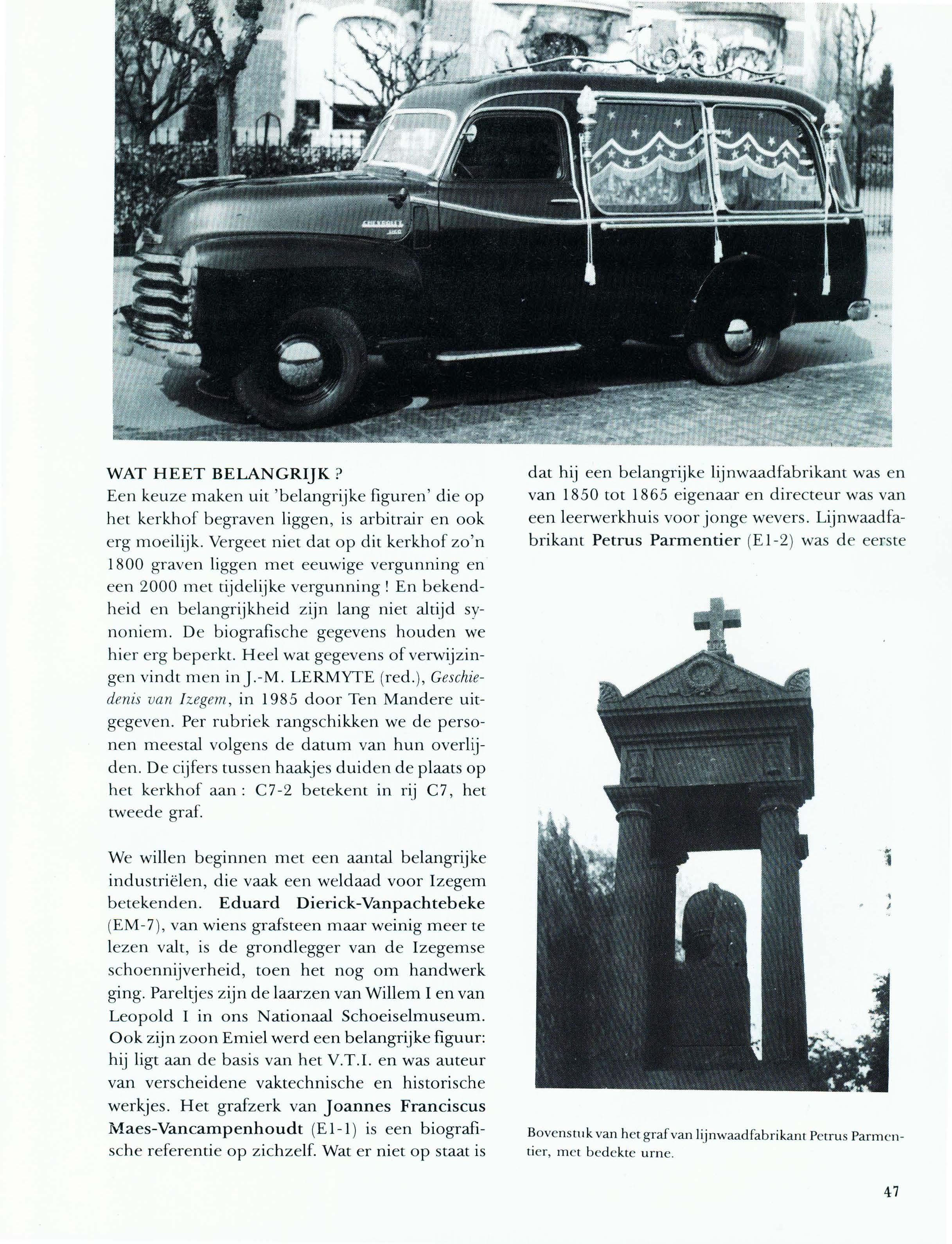We willen b eg inn e n m e t een aantal b e langrijke industri ë len , die vaak ee n weldaad voor Izegem b e te kenden . Eduard Dierick-Vanpac htebeke (EM-7), van wiens grafsteen maar weinig m ee r t e lez e n valt, is de grond l egger van de Izegemse schoennijverhe id, toen het nog om handwerk ging. zijn de laar zen van Willem I en van Leopold I in ons Nationaal Schoeiselmuseum Ook zijn zoon Emi e l w e rd een belangrijke figuur: hij ligt a a n d e basis van het Y.T.1. en was auteur van vers c h eidene vaktec hnische en historische werkjes. Het grafzerk van Joannes Franciscus Maes -Vancampenhoudt (El-I ) is een biografisch e refe renti e op zichzelf. Wat er niet op staat is