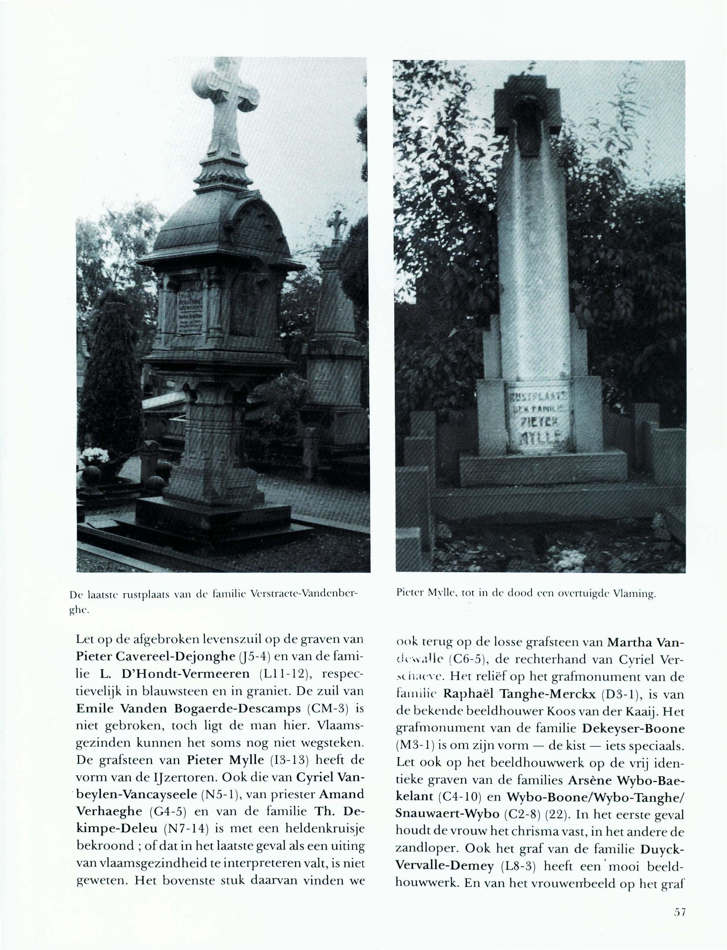 Let op d e afgebroken levensz uil op de graven van Pieter Cavereel-Dejonghe 05-4) e n van d e famili e L. D'Hondt-Vermeeren (Lll-12 ), r es p ectievelijk in blauwst ee n en in graniet. D e z uil van Emile Vanden Bogaerde-Descamps (CM- 3) is ni e t gebroken, toch ligt d e man hi e r. Vlaamsgez ind e n kunn e n h et so ms nog niet wegst e k e n D e grafsteen van Pieter Mylle (13-13) h ee ft d e vorm van de Ijzertor e n . Ook die van Cyriel Van. beylen- Vancayseele (N 5-1), van priester Amand Verhaeghe (G4-5 ) e n van d e familie Th . Dekimpe-Deleu (N7-14 ) is m e t een heldenkruisj e bekroond; of dat in h et laatst e geval als een uiting van vlaamsgezindheid t e int erpre t e ren valt, is ni et geweten. Het bov e nst e stuk d aa rvan vinden we