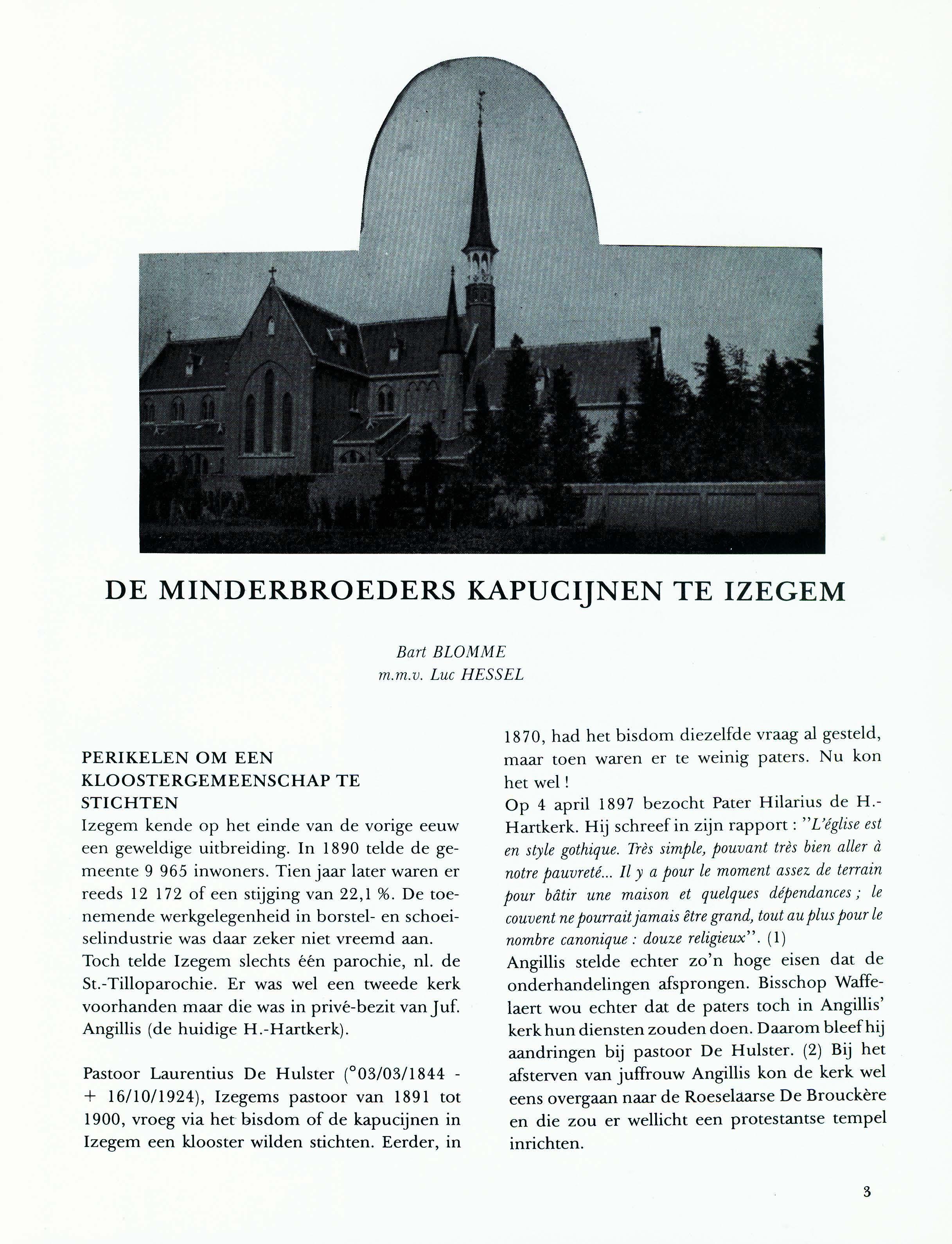 Pastoor Laurentius De Hulster (°03/03/1844+ 16/10/1924), Izegems pastoor van 1891 tot 1900, vroeg via het bisdom of de kapucijnen in Izegem een klooster wilden stichten. Eerder, in