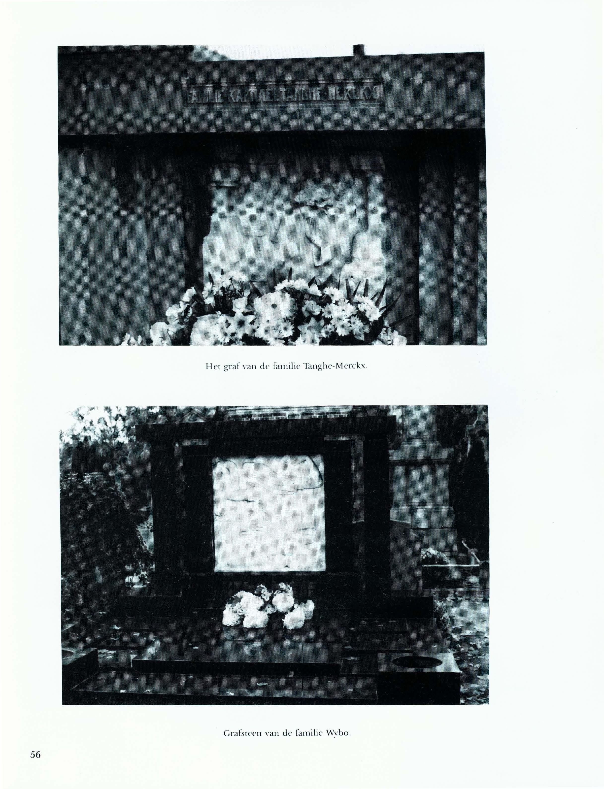 21. Enkele andere b eel dhouwwerken op dit ke rkhof z ijn niet van marmer , maar van geb akken aard e, of zijn ser iewerk Dat laatste geldt b.v voor de graven van J. D e Keyser- Bo ss u yt e n van Joseph Vangheluw e.