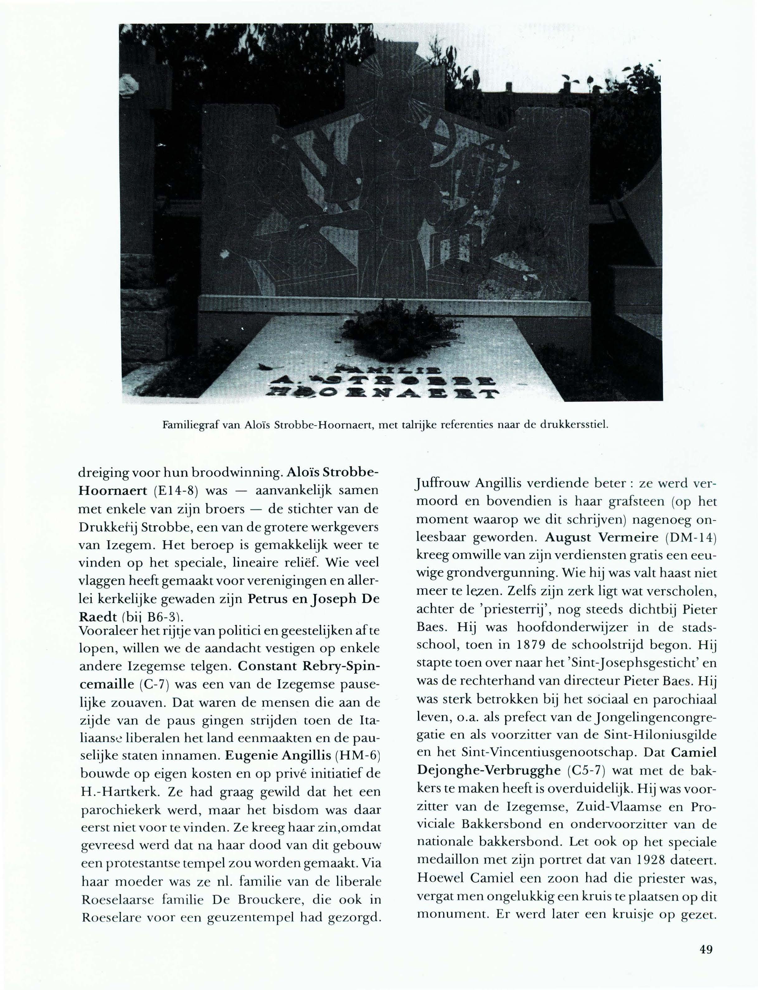 ] uffrouw Angillis verdi ende beter: ze werd vermoord en bovendien is haar grafsteen (op het moment waarop we dit schrijven) nagenoeg onleesbaar geworden August Vermeire (DM - 14 ) kreeg omwille van zijn verdiensten gratis een eeuwige grond vergunning Wie hij was valt haast niet meer te lezen. Zelfs zijn zerk ligt wat verscholen, achter de 'priesterrij' , nog steeds dichtbij Pieter Baes. Hij was hoofdonderwijzer in de stadsschool, toen in 1879 de schoolstrijd begon. Hij stapte toen over naar het 'Sint-] osephsgesticht' en was de rechterhand van directeur Pieter Baes Hij was sterk betrokken bij het sociaal en parochiaal leven, o.a. als prefec t van de] ongelingencongregatie en als voorzitter van de Sint-Hiloniusgilde en het Sint-Vincentiusgenootschap. Dat Camiel Dejonghe-Verbrugghe (C5-7) wat m e t de bakkers te maken heeft is overduidelijk. Hij was voorzitter van de Izeg emse, Zuid-Vlaamse en Proviciale Bakk e rsbond en ondervoorzitter van de nationale bakkersbond . Le t ook op h e t speciale medaillon met zijn portret dat van 1928 dateert. Hoewel Camiel ee n zoon had die priester was, vergat men ongelukkig ee n kruis te plaatsen op dit monument. Er werd lat e r een kruisj e op gezet.