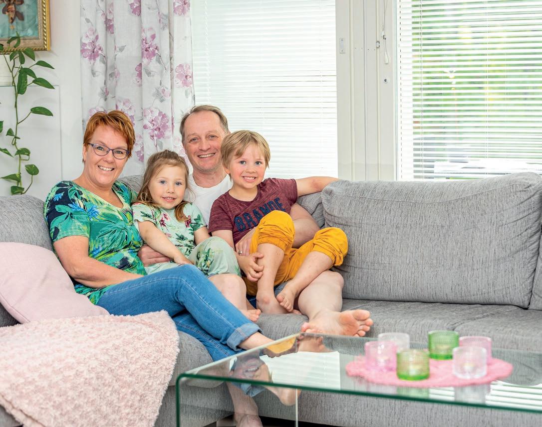 A urinko paistaa. Terassilla on las ten uima-allas, mutta nauru kuuluu trampoliinilta. Leevi, 7, ja Isla, 5, siellä näyttävät temp pujaan. Lotvosten viisihenkisestä perheestä on tullut lapsille kolmessa vuodessa tuttu paikka, jossa tavat ja säännöt tiedetään, lelu jen paikat tunnetaan ja nukkumaan on tur vallista käydä. Kun pöytä on katettu ja jauhelihakeitto lautasilla, lapset kutsutaan syömään. Pöydän ääreen istuvat vanhemmat Katja ja Kai Lot vonen , heidän lapsistaan keskimmäinen, Ilari, 19, sekä kuopus Roosa, 17, ja toki Leevi ja Isla. Karjalanpiirakoiden määrästä täytyy keskustella. Kun määrät on selvitetty, pie nimmät keskittyvät keittoihinsa. Roosa ker too, että perheen nuorimpana lapsena hän on aina pitänyt ajatuksesta, että hänellä olisi pikkusisaruksia.