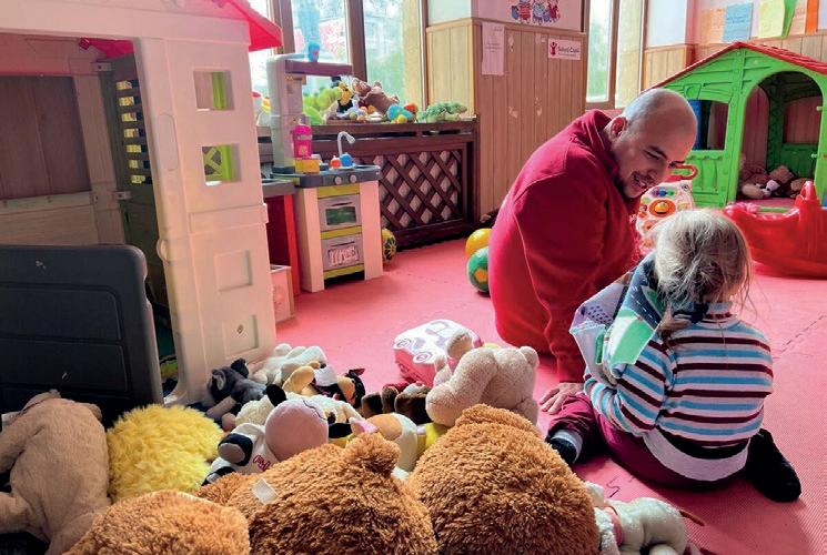 siystävällisten tilojen perustaminen laajemmassa mittakaavassa tuli jälleen ajankohtaiseksi tänä keväänä, kun Ukrainan sotaa pakenevat perheet tuli vat Suomeen etsimään turvaa. Perus timme vapaaehtoistemme tuella lap siystävällisiä tiloja eri puolille maata, Pelastakaa Lasten valmiussuunnittelun asiantuntija Anna Salmenhaara ker too.Suomessa lapsiystävällisiä tiloja pyörittävät Pelastakaa Lasten työnteki jät ja koulutetut vapaaehtoiset. Toimin nalla voidaan parhaimmillaan tukea viranomaisten ja muiden organisaati oiden toimintaa. Yleensä toiminta on lyhytaikaista ja väliaikaista, eli kestää sen aikaa kuin kriisin akuutti vaihe jat kuu. – Kriisejä ja konflikteja pakenevat lapset ovat usein joutuneet kokemaan asioita, joita yhdenkään lapsen ei pitäisi kokea. Jokaisella lapsella on poikkeus olojen keskelläkin tarve saada olla ihan vain lapsi, Salmenhaara sanoo. l Lasten nimet muutettu yksityisyyden suojaamiseksi Suomessa Pelastakaa Lapset perusti viime keväänä yhden lapsiystävällisistä tiloista Helsingin Länsisatamaan Ukrainan sotaa pakenevien lasten ja perheiden tukemiseksi heidän saapuessaan maahan. Reilun vuoden ikäinen Kristina pakeni Ukrainan sotaa Puolaan äitinsä Irinan ja 13-vuotiaan siskonsa Katian kanssa. Pelastakaa Lapset