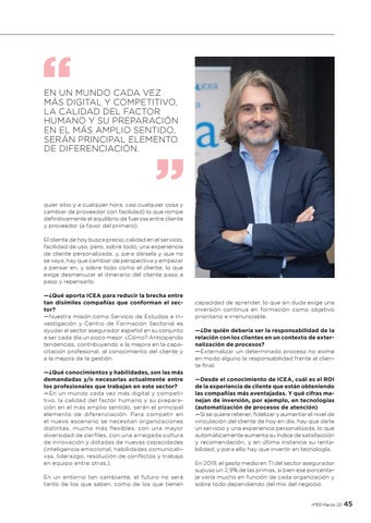 quier sitio y a cualquier hora, casi cualquier cosa y cambiar de proveedor con facilidad) lo que rompe definitivamente el equilibrio de fuerzas entre cliente y proveedor (a favor del primero). El cliente de hoy busca precio, calidad en el servicio, facilidad de uso, pero, sobre todo, una experiencia de cliente personalizada, y, para dársela y que no se vaya, hay que cambiar de perspectiva y empezar a pensar en, y sobre todo como el cliente, lo que exige desmenuzar el itinerario del cliente paso a paso y repensarlo. —¿Qué aporta ICEA para reducir la brecha entre tan disímiles compañías que conforman el sector? —Nuestra misión como Servicio de Estudios e Investigación y Centro de Formación Sectorial es ayudar al sector asegurador español en su conjunto a ser cada día un poco mejor. ¿Cómo? Anticipando tendencias, contribuyendo a la mejora en la capacitación profesional, al conocimiento del cliente y a la mejora de la gestión. —¿Qué conocimientos y habilidades, son las más demandadas y/o necesarias actualmente entre los profesionales que trabajan en este sector? —En un mundo cada vez más digital y competitivo, la calidad del factor humano y su preparación en el más amplio sentido, serán el principal elemento de diferenciación. Para competir en el nuevo escenario se necesitan organizaciones distintas, mucho más flexibles, con una mayor diversidad de perfiles, con una arraigada cultura de innovación y dotadas de nuevas capacidades (inteligencia emocional, habilidades comunicativas, liderazgo, resolución de conflictos y trabajo en equipo entre otras.). En un entorno tan cambiante, el futuro no será tanto de los que saben, como de los que tienen