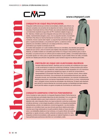 www.cmpsport.com CHAQUETA DE ESQUÍ MULTIFUNCIONAL Chaqueta multifuncional que combina funcionalidad y diseño para ofrecer una solución completa a los amantes de los deportes de invierno, incluso fuera de las pistas. El laminado térmico Clima Protect, las costuras totalmente selladas y el tratamiento repelente al agua libre de PFC mantienen alejado el agua y el frío. Además, el faldón para nieve integrado evita que entre nieve durante las caídas, manteniéndote abrigado y seco. Con su pequeño tamaño, el acolchado Feel Warm Flat ofrece la máxima libertad de movimiento, así como un calor constante, incluso cuando está mojado. La capucha fija es fácilmente ajustable, para un ajuste personalizado y una protección óptima. La abertura central presenta una cremallera cubierta por una solapa protectora y botones automáticos que impiden la entrada de aire frío. El modelo está equipado con cuatro bolsillos externos con cremallera, dos laterales para guardar objetos de uso común y dos en el pecho para objetos más pequeños o dispositivos electrónicos. Además, un bolsillo invisible con cremallera para forfait en la manga lo hace perfecto para un día en las pistas. Los puños de lycra con orificios para los dedos brindan calidez y comodidad adicionales y se pueden ajustar con velcro para un ajuste personalizado. El gran bolsillo interno de malla y el bolsillo secreto son ideales para artículos más grandes o para mantener seguros los efectos personales.