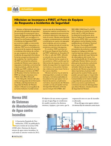 A Asociación Española de Normalización, UNE, ha publicado la nueva versión de la norma UNE 23500 sobre «Sistemas de abastecimiento de agua contra incendios», la cual anula su anterior versión de 2012. 8 INSTALSEC