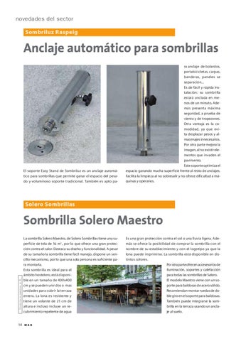 Es una gran protección contra el sol o una lluvia ligera. Además se ofrece la posibilidad de comprar la sombrilla con el nombre de su establecimiento y con el logotipo ya que la lona puede imprimirse. La sombrilla está disponible en distintos colores. Por otra parte ofrecen accesesorios de iluminación, soportes y calefacción para todas las sombrillas de Solero. El modelo Maestro viene con un soporte para baldosas de acero sólido. Recomiendan montar ruedas de doble giro en el soporte para baldosas. También puede integrarse la sombrilla en la terraza usando un anclaje al suelo.