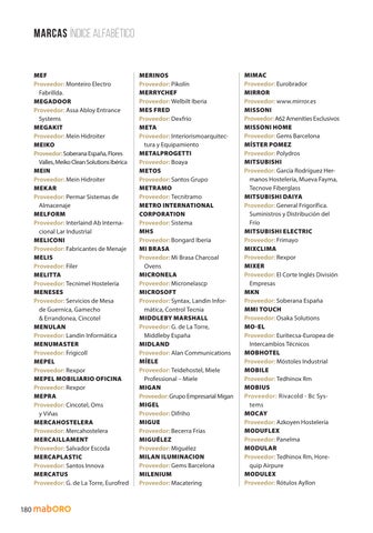 Mef Proveedor: Monteiro Electro Fabrillda. Megadoor Proveedor: Assa Abloy Entrance Systems Megakit Proveedor: Mein Hidroiter Meiko Proveedor: Soberana España, Flores Valles, Meiko Clean Solutions Ibérica Mein Proveedor: Mein Hidroiter Mekar Proveedor: Permar Sistemas de Almacenaje Melform Proveedor: Interlaind Ab Internacional Lar Industrial Meliconi Proveedor: Fabricantes de Menaje Melis Proveedor: Filer Melitta Proveedor: Tecnimel Hostelería Meneses Proveedor: Servicios de Mesa de Guernica, Gamecho & Errandonea, Cincotel Menulan Proveedor: Landin Informática Menumaster Proveedor: Frigicoll Mepel Proveedor: Rexpor Mepel Mobiliario Oficina Proveedor: Rexpor Mepra Proveedor: Cincotel, Oms y Viñas Mercahostelera Proveedor: Mercahostelera Mercaillament Proveedor: Salvador Escoda Mercaplastic Proveedor: Santos Innova Mercatus Proveedor: G. de La Torre, Eurofred