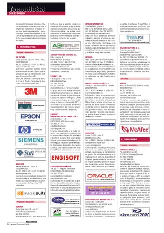 INTEGRA INTERACTIVE Torre MAPFRE, planta 28. Marina, 16-18 • 08005 BARCELONA. Tel.: 902 947 869 • Fax: 902 947870. info@integra.tv • www.integra.tv Integra TV es un sistema de televisión interactiva dirigido a hoteles que permite al huésped disfrutar de servicios de ocio, información y teletrabajo en la propia habitación durante su estancia (películas bajo demanda, juegos de consola, Office TV, Internet de banda ancha y gestión de fotografías digitales). INTERBEL Marie Curie, s/n • 08042 BARCELONA. Tel.: 902 39 39 39 • Fax: 93 276 88 28. intebel@interbel.es • www.interbel.es Ofrece software y soluciones de Internet en las categorías de correo electrónico, comunicación, seguridad y gestión de PC-redes para empresas con el objetivo de ayudarlas a ser más eficientes en su actividad. MICROS FIDELIO ESPAÑA, S. L. Orense, 4 - planta 11 (Edificio Estrella). 28020 MADRID. Tel.: 91 41 77 540 • Fax: 91 55 66 197. www.micros-fidelio.es Fabricación, venta e implantación de soluciones hoteleras y de restauración. Con oficinas en Madrid y Barcelona, Micros-Fidelio ofrece aplicaciones para todas las áreas: central de reservas, central de gestión, recepción, almacenes, puntos de venta, yield management, salones y eventos, área financiera, gestión de apartamentos y motor de reservas por Internet.