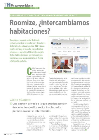 Roomize, ¿intercambiamos habitaciones? Roomize es una red social dedicada exclusivamente a propietarios y directores de hoteles, boutique hoteles, B&B y casas rurales en todo el mundo, cuyo objetivo principal es permitir el libre intercambio de las habitaciones de las instalaciones hoteleras, para uso personal y de forma totalmente gratuita.