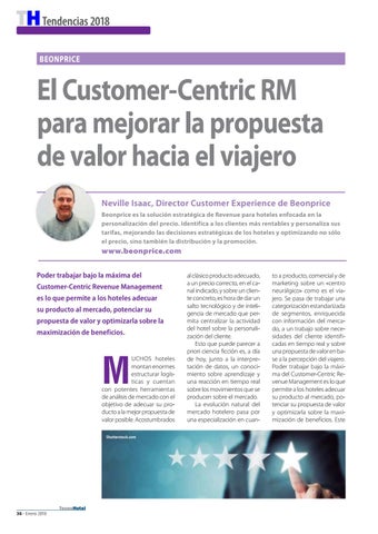 to a producto, comercial y de marketing sobre un «centro neurálgico» como es el viajero. Se pasa de trabajar una categorización estandarizada de segmentos, enriquecida con información del mercado, a un trabajo sobre necesidades del cliente identificadas en tiempo real y sobre una propuesta de valor en base a la percepción del viajero. Poder trabajar bajo la máxima del Customer-Centric Revenue Management es lo que permite a los hoteles adecuar su producto al mercado, potenciar su propuesta de valor y optimizarla sobre la maximización de beneficios. Este