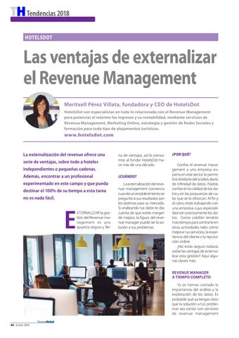 Las ventajas de externalizar el Revenue Management Meritxell Pérez Villata, fundadora y CEO de HotelsDot HotelsDot son especialistas en todo lo relacionado con el Revenue Management para potenciar al máximo los ingresos y su rentabilidad, mediante servicios de Revenue Management, Marketing Online, estrategia y gestión de Redes Sociales y formación para todo tipo de alojamientos turísticos.