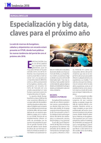 so, teniendo en cuenta sus búsquedas dentro del portal. «Creemos que esta es la mejor forma de actuar para poder ofrecer a cualquier persona una experiencia a su medida. Y no solo eso, sino que nos interesamos en conocer cómo ha sido dicha experiencia, tanto en el establecimiento como durante la reserva a través de la web, para así seguir mejorando», explican. Y la comunicación con ellos es constante y fluida. «Nos encargamos de que nuestros clientes no pierdan ningún detalle de nuestras ofertas y novedades. Nosotros somos su mejor consejero, ya que como profesionales del sector conocemos el producto de primera mano», añaden desde la plataforma. Además, en BungalowsClub apuestan por una nueva perspectiva sobre el marketing de contenidos y se aseguran de que su mensaje llegue. ¿Cómo? A través de las acciones diarias que llevan a cabo tanto en redes sociales como vía emailing, entre otras. n