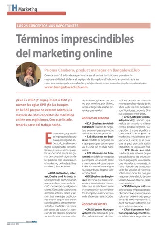 Términos imprescindibles del marketing online Paloma Cambero, product manager en BungalowsClub Cuenta con 15 años de experiencia en el sector turístico en puestos de responsabilidad. Lidera el equipo de BungalowsClub, web especializada en reservas en bungalows, cabañas y alojamientos con encanto en plena naturaleza.