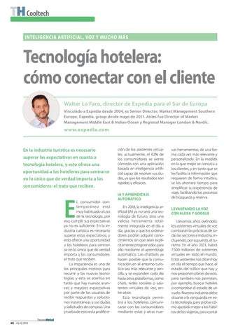 vas herramientas, de una forma cada vez más relevante y personalizada. En la medida en la que mejor se conozca a los clientes, y en tanto que se les facilita la información que requieren de forma intuitiva, se les ahorrará tiempo para simplificar su experiencia de viaje, facilitando los procesos de búsqueda y reserva. Levantando la voz con Alexa y Google Llevamos años oyéndolo: los asistentes virtuales de voz cambiarán las prácticas de todas las sectores e industria, incluyendo, por supuesto, el turismo. En el año 2021, habrá 7.500 millones de asistentes virtuales en todo el mundo. Estos asistentes nos dicen hoy en día el tiempo que hace, el estado del tráfico que hay y nos proponen planes de ocio, pero también nos permiten, por ejemplo, buscar hoteles o comprobar el estado de un vuelo. Nuestra industria debe situarse a la vanguardia en esta tecnología, para probar cómo ajustarla mejor a los hábitos de los viajeros, para contar