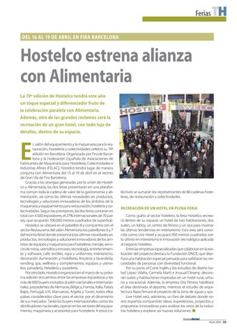 Hostelco estrena alianza con Alimentaria La 19ª edición de Hostelco tendrá este año un toque especial y diferenciador fruto de la celebración paralela con Alimentaria. Además, otro de las grandes reclamos será la recreación de un gran hotel, con todo lujo de detalles, dentro de su espacio.