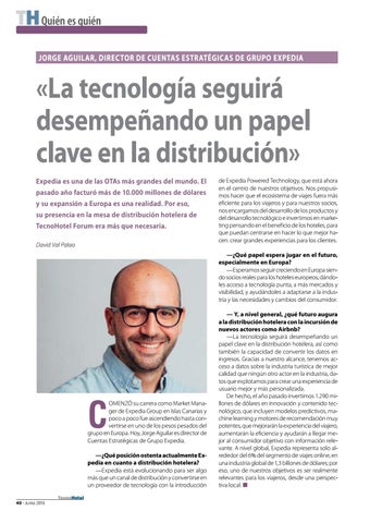 de Expedia Powered Technology, que está ahora en el centro de nuestros objetivos. Nos propusimos hacer que el ecosistema de viajes fuera más eficiente para los viajeros y para nuestros socios, nos encargamos del desarrollo de los productos y del desarrollo tecnológico e invertimos en marketing pensando en el beneficio de los hoteles, para que puedan centrarse en hacer lo que mejor hacen: crear grandes experiencias para los clientes. —¿Qué papel espera jugar en el futuro, especialmente en Europa? —Esperamos seguir creciendo en Europa siendo socios reales para los hoteles europeos, dándoles acceso a tecnología punta, a más mercados y visibilidad, y ayudándoles a adaptarse a la industria y las necesidades y cambios del consumidor.