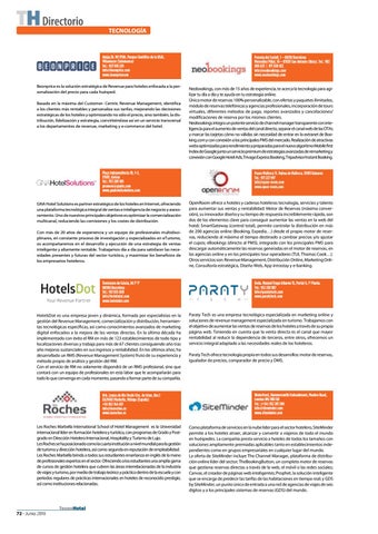 Passeig del Castell, 1 – 08292 Barcelona Menendez Pídal, 14 – 07820 San Antonio (Ibiza). Tel.: 902 886 623 | 971 340 822 info@neobookings.com www.neobookings.com Neobookings, con más de 15 años de experiencia, te acerca la tecnología para agilizar tu día a día y te ayuda en tu estrategia online. Único motor de reservas 100% personalizable, con ofertas y paquetes ilimitados, módulo de reservas telefónicas y agencias profesionales, incorporación de tours virtuales, diferentes métodos de pago, reportes avanzados y cancelaciones/ modificaciones de reserva por los mismos clientes. Neobookings integra un potente servicio de channel manager transparente con inteligencia para el aumento de ventas del canal directo, separar el canal web de las OTAs y marcar las tarjetas cómo no válidas sin necesidad de entrar en la extranet de Booking.com y con conexión a los principales PMS del mercado. Realización de atractivas webs optimizadas para rendimiento y preparadas para el nuevo algoritmo Mobile first Index de Google junto un servicio premium de estrategias avanzadas de remarketing y conexión con Google Hotel Ads, Trivago Express Booking, Tripadvisor Instant Booking. Paseo Mallorca 11. Palma de Mallorca. 07011 Baleares Tel.: 971 227 997 info@open-room.com www.open-room.com OpenRoom ofrece a hoteles y cadenas hoteleras tecnología, servicios y talento para aumentar sus ventas y rentabilidad: Motor de Reservas (máxima conversión), su innovador diseño y su tiempo de respuesta increíblemente rápido, son dos de los elementos clave para conseguir aumentar las ventas en la web del hotel; SmartGateway (control total), permite controlar la distribución en más de 200 agencias online (Booking, Expedia…) desde el propio motor de reservas, reduciendo al máximo el tiempo destinado a cambiar precios y/o ajustar el cupos; eBookings (directo al PMS), integrado con los principales PMS para descargar automáticamente las reservas generadas en el motor de reservas, en las agencias online y en los principales tour operadores (TUI, Thomas Cook…). Otros servicios son: Revenue Management, Distribución Online, Marketing Online, Consultoría estratégica, Diseño Web, App intrastay y e-banking.