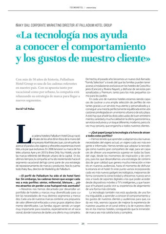 «La tecnología nos ayuda a conocer el comportamiento y los gustos de nuestro cliente» Con más de 50 años de historia, Palladium Hotel Group es una de las cadenas referentes en nuestro país. Con su apuesta tanto por vacacional como por urbano, la compañía está relanzando su estrategia de marca para llegar a nuevos segmentos.