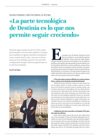 —Tras unos años un poco difíciles en cuanto a beneficios, ¿cómo es la situación actual de Destinia? —Siempre hemos crecido, aunque en este sector crecer no tiene mérito. O creces o estás muerto. Es cierto que en los últimos tiempos hemos crecido menos, pero ahora crecemos en dos dígitos otra vez. Bastante por encima de la media del sector. Hemos encontrado nuevos proyectos que como empresa nos emocionan mucho. Que una tecnológica española firmara un acuerdo con empresas como Kayak parecía impensable hasta no hace mucho. Nuestro objetivo es seguir creciendo y ser rentable. Somos una empresa española sin inversión externa, por eso, si una cosa no es rentable en un año dejamos de hacerla. El objetivo es crecer, pero enfocarnos sobre todo en la rentabilidad. —Hablemos de esos acuerdos con Kayak y H10, que han sido los últimos. —Nos hemos dado cuenta de que lo que mejor hacemos es la tecnología. Al final, el coste de adquisición de un cliente es cada vez más elevado, pues hay grandes players en el mercado. Pero la parte tecnológica, el hecho de poder combinar todos nuestros productos, es lo que nos ha permitido seguir creciendo. Por ejemplo, somos el único player que está en 19 mercados de Kayak, bien con marca