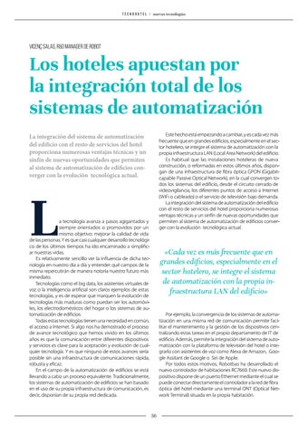 Los hoteles apuestan por la integración total de los sistemas de automatización Este hecho está empezando a cambiar, y es cada vez más frecuente que en grandes edificios, especialmente en el sector hotelero, se integre el sistema de automatización con la propia infraestructura LAN (Local Area Network) del edificio. Es habitual que las instalaciones hoteleras de nueva construcción, o reformadas en estos últimos años, dispongan de una infraestructura de fibra óptica GPON (Gigabitcapable Passive Optical Network), en la cual convergen todos los sistemas del edificio, desde el circuito cerrado de videovigilancia, los diferentes puntos de acceso a Internet (WiFi o cableado) o el servicio de televisión bajo demanda. La integración del sistema de automatización del edificio con el resto de servicios del hotel proporciona numerosas ventajas técnicas y un sinfín de nuevas oportunidades que permiten al sistema de automatización de edificios converger con la evolución tecnológica actual.