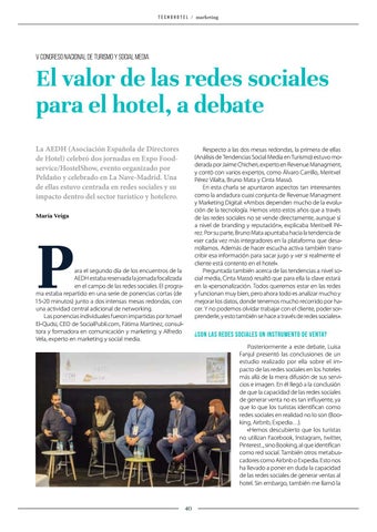 El valor de las redes sociales para el hotel, a debate La AEDH (Asociación Española de Directores de Hotel) celebró dos jornadas en Expo Foodservice/HostelShow, evento organizado por Peldaño y celebrado en La Nave-Madrid. Una de ellas estuvo centrada en redes sociales y su impacto dentro del sector turístico y hotelero.