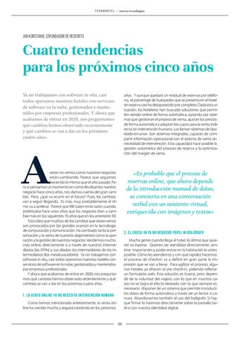 veces no vemos como nuestros negocios están cambiando. Parece que seguimos haciendo lo mismo que el año pasado. Pero si pensamos un momento en como llevábamos nuestro negocio hace cinco años, nos damos cuenta del gran cambio. Pero, ¿qué va ocurrir en el futuro? Pues, los cambios van a seguir llegando. Es más, muy probablemente el ritmo va a acelerar. Parece que Bill Gates tenía razón cuando profetizaba hace unos años que los negocios iban a cambiar más en los siguientes 10 años que en los anteriores 50. Está claro que muchos de los cambios que observamos son provocados por los grandes avances en la tecnología de computación y comunicación. Ha cambiado tanto la presentación y la venta de nuestros alojamientos como la operación y la gestión de nuestros negocios. Vendemos mucho más online, directamente o a través de nuestros intermediarios (las OTAs) y sus aliados: los intermediarios de los intermediarios (los metabuscadores). Ya no trabajamos con software in situ, casi todos operamos nuestros hoteles con servicios de software en la nube, gestionados y mantenidos por empresas profesionales. Y ahora que acabamos de entrar en 2020, nos preguntamos qué cambios hemos observado recientemente y qué cambios se van a dar en los próximos cuatro años.