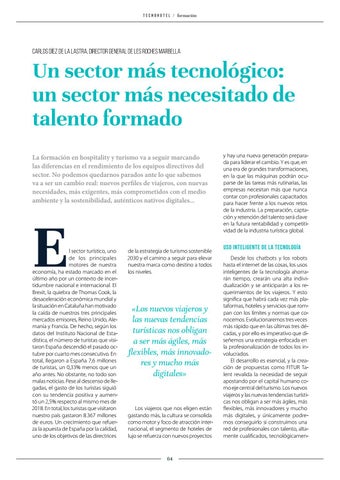 Uso inteligente de la tecnología Desde los chatbots y los robots hasta el internet de las cosas, los usos inteligentes de la tecnología ahorrarán tiempo, crearán una alta individualización y se anticiparán a los requerimientos de los viajeros. Y esto significa que habrá cada vez más plataformas, hoteles y servicios que rompan con los límites y normas que conocemos. Evolucionaremos tres veces más rápido que en las últimas tres décadas, y por ello es imperativo que diseñemos una estrategia enfocada en la profesionalización de todos los involucrados. El desarrollo es esencial, y la creación de propuestas como FITUR Talent revalida la necesidad de seguir apostando por el capital humano como eje central del turismo. Los nuevos viajeros y las nuevas tendencias turísticas nos obligan a ser más ágiles, más flexibles, más innovadores y mucho más digitales, y únicamente podremos conseguirlo si construimos una red de profesionales con talento, altamente cualificados, tecnológicamen-