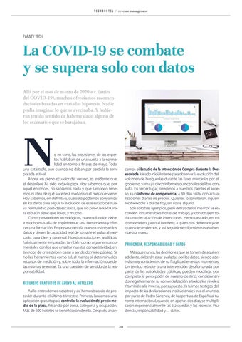 camos el Estudio de la Intención de Compra durante la Desescalada. Ideado inicialmente para observar la evolución del volumen de búsquedas durante las fases marcadas por el gobierno, suma ya cinco informes quincenales de libre consulta. En tercer lugar, ofrecimos a nuestros clientes el acceso a un informe de competencia, a 30 días vista, con actualizaciones diarias de precios. Quienes lo solicitaron, siguen recibiéndolo a día de hoy, sin coste alguno. Son solo tres ejemplos, pero detrás de los mismos se esconden innumerables horas de trabajo, y constituyen toda una declaración de intenciones. Hemos estado, en todo momento, junto al hotelero, a quien nos debemos y de quien dependemos, y así seguirá siendo mientras esté en nuestra mano.