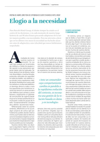 Elogio a la necesidad Para Barceló Hotel Group, el cliente siempre ha estado en el centro de las decisiones, y en cada momento de nuestra larga historia de casi 90 años hemos procurado adaptarnos de la mejor manera posible a sus necesidades. Pero me atrevería a decir que en los últimos tres meses la necesidad nos ha hecho alcanzar cotas de adaptación a una velocidad que nunca hubiéramos sospechado.