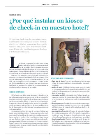 a crisis del coronavirus ha traído una apertura escalonada de los hoteles y una serie de medidas de seguridad, aforo y distanciamiento social que han puesto a la digitalización en el centro de la estrategia hotelera. Por eso, el kiosco de check-in se ha convertido en una herramienta fundamental en esta nueva normalidad. Además, esta solución no condiciona la existencia de otras tecnologías en el hotel y es de fácil manejo para todo tipo de huéspedes. Asimismo, es una herramienta compatible con multitud de tipos de cerraduras, incluso con las no electrónicas. Esto es, una solución que permite controlar el aforo en la recepción, reducir las esperas y mejorar la productividad del personal de recepción.