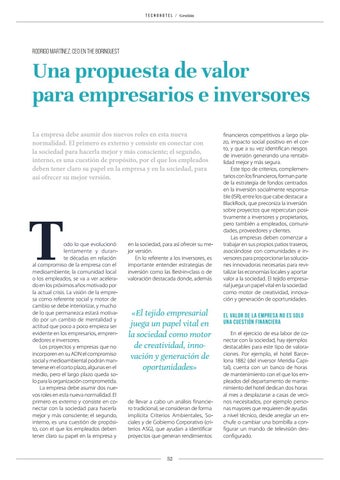 odo lo que evolucionó lentamente y durante décadas en relación al compromiso de la empresa con el medioambiente, la comunidad local o los empleados, se va a ver acelerado en los próximos años motivado por la actual crisis. La visión de la empresa como referente social y motor de cambio se debe interiorizar, y mucho de lo que permanezca estará motivado por un cambio de mentalidad y actitud que poco a poco empieza ser evidente en los empresarios, emprendedores e inversores. Los proyectos y empresas que no incorporen en su ADN el compromiso social y medioambiental podrán mantenerse en el corto plazo, algunas en el medio, pero el largo plazo queda solo para la organización comprometida. La empresa debe asumir dos nuevos roles en esta nueva normalidad. El primero es externo y consiste en conectar con la sociedad para hacerla mejor y más consciente; el segundo, interno, es una cuestión de propósito, con el que los empleados deben tener claro su papel en la empresa y