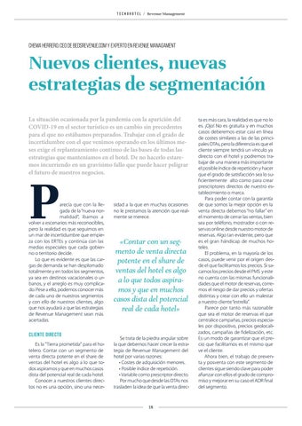 arecía que con la llegada de la “nueva normalidad”, íbamos a volver a escenarios más reconocibles, pero la realidad es que seguimos en un mar de incertidumbre que empieza con los ERTEs y continúa con las medias especiales que cada gobierno o territorio decide. Lo que es evidente es que las cargas de demanda se han desplomado totalmente y en todos los segmentos, ya sea en destinos vacacionales o urbanos, y el arreglo es muy complicado. Pese a ello, podemos conocer más de cada uno de nuestros segmentos y con ello de nuestros clientes, algo que nos ayudará a que las estrategias de Revenue Management sean más acertadas.