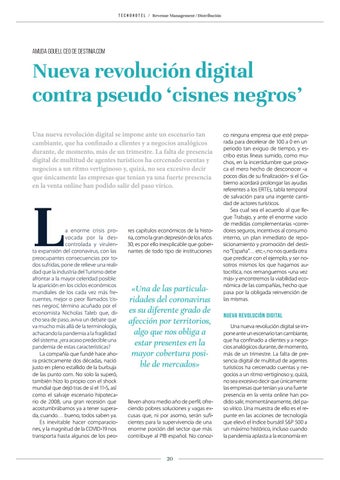 Nueva revolución digital contra pseudo ‘cisnes negros’ Una nueva revolución digital se impone ante un escenario tan cambiante, que ha confinado a clientes y a negocios analógicos durante, de momento, más de un trimestre. La falta de presencia digital de multitud de agentes turísticos ha cercenado cuentas y negocios a un ritmo vertiginoso y, quizá, no sea excesivo decir que únicamente las empresas que tenían ya una fuerte presencia en la venta online han podido salir del paso vírico.