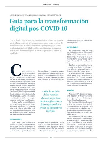 Guía para la transformación digital pos-COVID-19 Tras el shock, llegó el proceso de asimilación. Ahora toca tomar las riendas y ponernos a trabajar cuanto antes en un proceso de transformación. A tal fin, elaboro esta guía para que la trates con la máxima objetividad posible, adaptándola a tu negocio turístico de forma inteligente. Recuerda que el éxito está en el equilibrio.