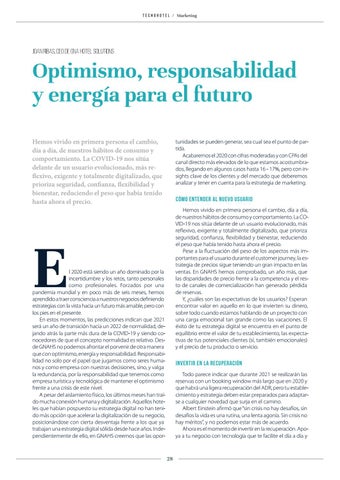 l 2020 está siendo un año dominado por la incertidumbre y los retos, tanto personales como profesionales. Forzados por una pandemia mundial y en poco más de seis meses, hemos aprendido a traer consciencia a nuestros negocios definiendo estrategias con la vista hacia un futuro más amable, pero con los pies en el presente. En estos momentos, las predicciones indican que 2021 será un año de transición hacia un 2022 de normalidad, dejando atrás la parte más dura de la COVID-19 y siendo conocedores de que el concepto normalidad es relativo. Desde GNAHS no podemos afrontar el porvenir de otra manera que con optimismo, energía y responsabilidad. Responsabilidad no solo por el papel que jugamos como seres humanos y como empresa con nuestras decisiones, sino, y valga la redundancia, por la responsabilidad que tenemos como empresa turística y tecnológica de mantener el optimismo frente a una crisis de este nivel. A pesar del aislamiento físico, los últimos meses han traído mucha conexión humana y digitalización. Aquellos hoteles que habían pospuesto su estrategia digital no han tenido más opción que acelerar la digitalización de su negocio, posicionándose con cierta desventaja frente a los que ya trabajan una estrategia digital sólida desde hace años. Independientemente de ello, en GNAHS creemos que las opor-