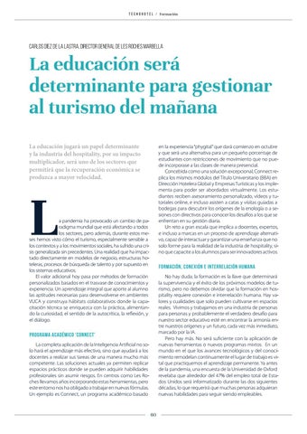 en la experiencia “phygital” que dará comienzo en octubre y que será una alternativa para un pequeño porcentaje de estudiantes con restricciones de movimiento que no puede incorporase a las clases de manera presencial. Concebida como una solución excepcional, Connect replica los mismos módulos del Título Universitario (BBA) en Dirección Hotelera Global y Empresas Turísticas y los implementa para poder ser abordados virtualmente. Los estudiantes reciben asesoramiento personalizado, vídeos y tutoriales online, e incluso asisten a catas y visitas guiadas a bodegas para descubrir los orígenes de la enología o a sesiones con directivos para conocer los desafíos a los que se enfrentan en su gestión diaria. Un reto a gran escala que implica a docentes, expertos, e incluso a marcas en un proceso de aprendizaje alternativo, capaz de interactuar y garantizar una enseñanza que no solo forme para la realidad de la industria de hospitality, sino que capacite a los alumnos para ser innovadores activos.