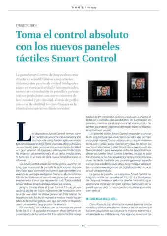 Toma el control absoluto con los nuevos paneles táctiles Smart Control La gama Smart Control de Jung es ahora más atractiva y versátil. Gracias a importantes mejoras, estos paneles de control inteligentes ganan en espectacularidad y funcionalidades, aumentan su resolución de pantalla y enriquecen sus prestaciones con nuevos sensores de luminosidad y proximidad, además de perfeccionar su flexibilidad funcional basada en la arquitectura operativa cliente-servidor.
